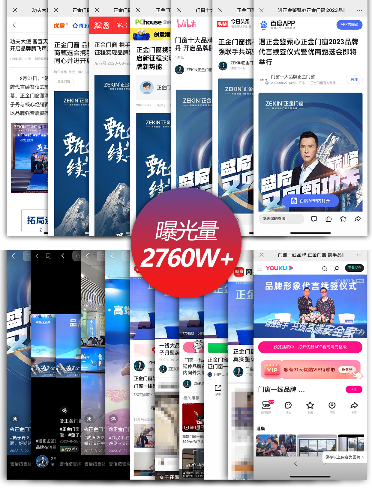 硬核實力品牌與**頂流巨星強強聯合,國民頂流雙重加持,引發業內人士的廣泛關注打call和多家媒體競相報道,形成覆蓋廣泛的全網媒體傳播矩陣!同時結合正金門窗全渠道引流曝光,通過全社交媒體平臺發布引起熱烈關注,使得全網曝光量高達2760W!讓正金門窗在全網強勢出圈,實現了品牌內容的廣覆蓋、品牌傳播的高熱度。
