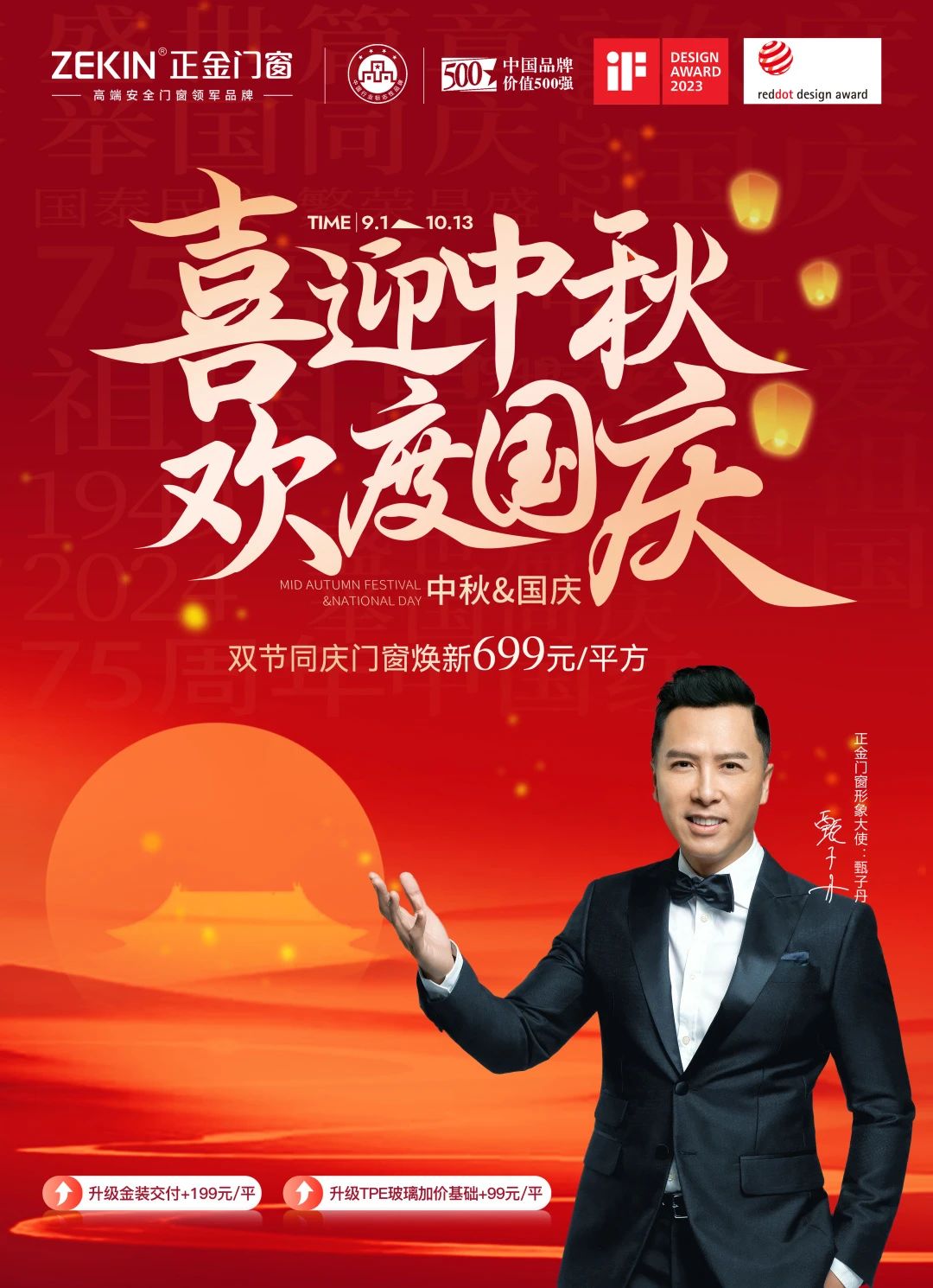 金秋盛惠 沒有大優惠 哪敢驚動你 正金門窗 9月全國聯動大促 禮遇雙節讓利直供 讓“甄”品質惠及千萬家 9月1日-10月13日 正金門窗 鉅惠來襲 匠心鉅獻 雙節同慶 煥新699元/平方 邀您共鑒“甄”品質 煥新家居視界